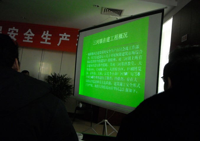 黨組書記張永安同志首先就肥西縣建設(shè)局發(fā)布的 “建設(shè)[2009]151號(hào),建設(shè)[2009]154號(hào),建設(shè)[2009]155號(hào)”文件中的工作進(jìn)行安排。接著解軍培同志講述了“百日會(huì)戰(zhàn)”開展情況,并就安全檢查中存在的隱患以幻燈片的形式展示給參會(huì)企業(yè),讓企業(yè)領(lǐng)導(dǎo)體會(huì)在建項(xiàng)目安全隱患的嚴(yán)重性以及安全隱患處理的緊迫性。李紹敏同志就施工報(bào)建、安全生產(chǎn)、農(nóng)民工工資等問題提出存在的問題及整改要求,重點(diǎn)對(duì)施工用電、臨邊防護(hù)、腳手架搭設(shè)及地面硬化、施工機(jī)具現(xiàn)場防護(hù)及現(xiàn)場施工人員的安全意識(shí)等方面存在的問題進(jìn)行批評(píng)和教育,要求企業(yè)領(lǐng)導(dǎo)一定要在安全生產(chǎn)過程中起帶頭作用,深入項(xiàng)目施工現(xiàn)場,親自把關(guān),把整改措施落實(shí)到位。