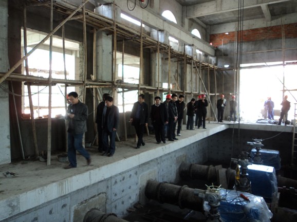 檢查組一行認(rèn)真查看了施工現(xiàn)場,對(duì)泵站主體、進(jìn)水池、出水池、機(jī)電設(shè)備安裝等進(jìn)行了細(xì)致檢查,并向施工人員詳細(xì)詢問了泵站建設(shè)階段的相關(guān)技術(shù)問題。隨后又對(duì)我公司施工資料進(jìn)行了檢查。