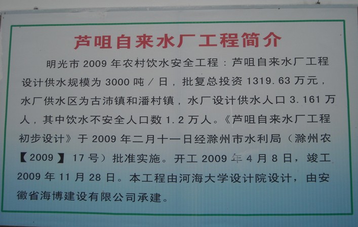 明光市蘆咀自來水廠工程是明光市2009年農村飲水安全項目的一部分,我公司克服地理位置偏僻、資金短缺、施工難度大等許多困難,精心組織施工力量,積極協調施工環境,安全生產,文明施工,最終按進度保質保量圓滿完成了施工任務。