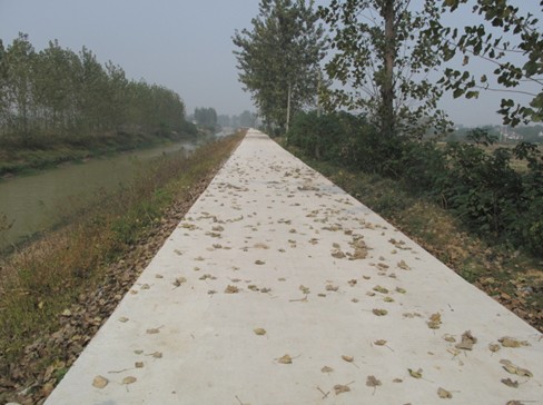 為降低干渠通水對工期的影響,我項目部精心謀劃,在干渠通水期間順利完成2300米的混凝土防汛道路。現(xiàn)在干渠通水任務(wù)基本結(jié)束,項目部一邊積極排水降低水位,爭取早日復(fù)工;一邊組織實施二次坡面修整,以確保混凝土護(hù)坡的質(zhì)量和美觀。