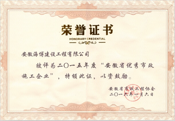 2015年度“安徽省優(yōu)秀市政施工企業(yè)”評選結果于近日揭曉,此次全省共評選出40家優(yōu)秀市政施工企業(yè),熱烈祝賀安徽海博建設工程有限公司位列其中。