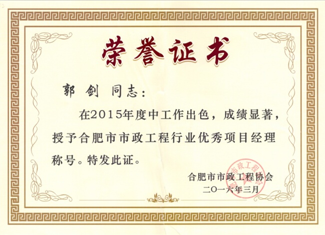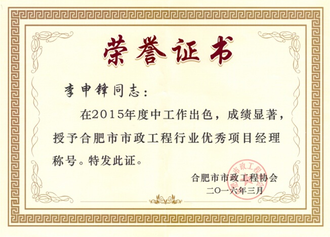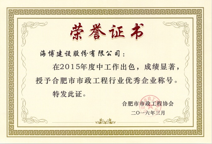 合肥市市政工程協(xié)會(huì)第三屆三次理事大會(huì)于昨日召開,會(huì)上對2015年度評選出的合肥市市政工程“優(yōu)秀企業(yè)”和“優(yōu)秀項(xiàng)目經(jīng)理”進(jìn)行表彰,海博建設(shè)股份有限公司榜上有名,并且我司李申鋒、郭劍兩位同志也榮獲“優(yōu)秀項(xiàng)目經(jīng)理”稱號。