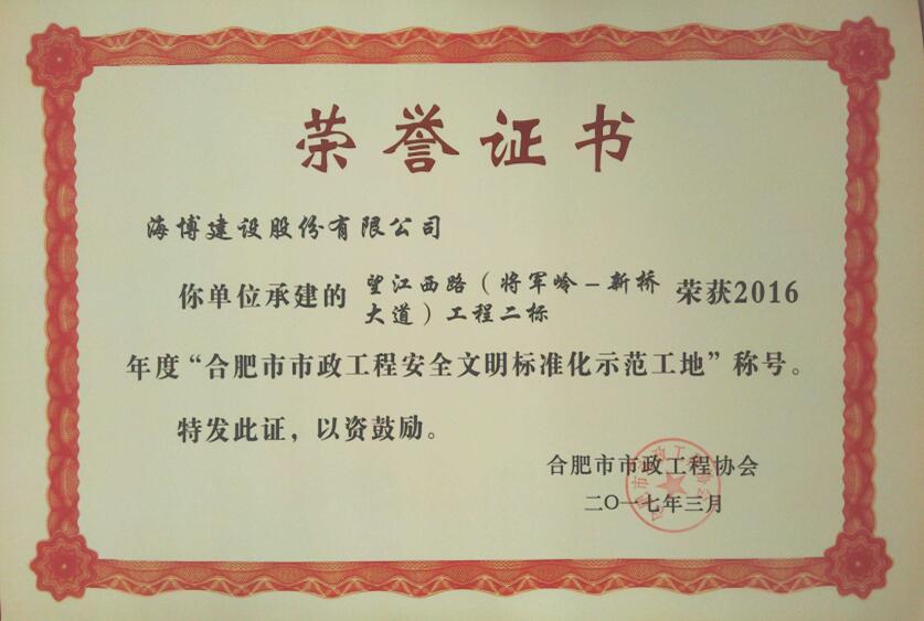 望江西路(將軍嶺路-新橋大道)建設(shè)工程二標(biāo)是空港產(chǎn)業(yè)新城與主城區(qū)重要通道,該工程積極開(kāi)展安全生產(chǎn)文明施工標(biāo)準(zhǔn)化管理成效顯著,近日榮獲合肥市2016年度“市政工程安全文明標(biāo)準(zhǔn)化示范工地”。同時(shí),該工程受到合肥市公路管理局的高度評(píng)價(jià),已經(jīng)通過(guò)“平安工地”的評(píng)審。
