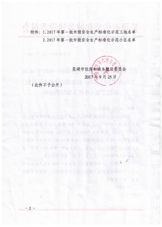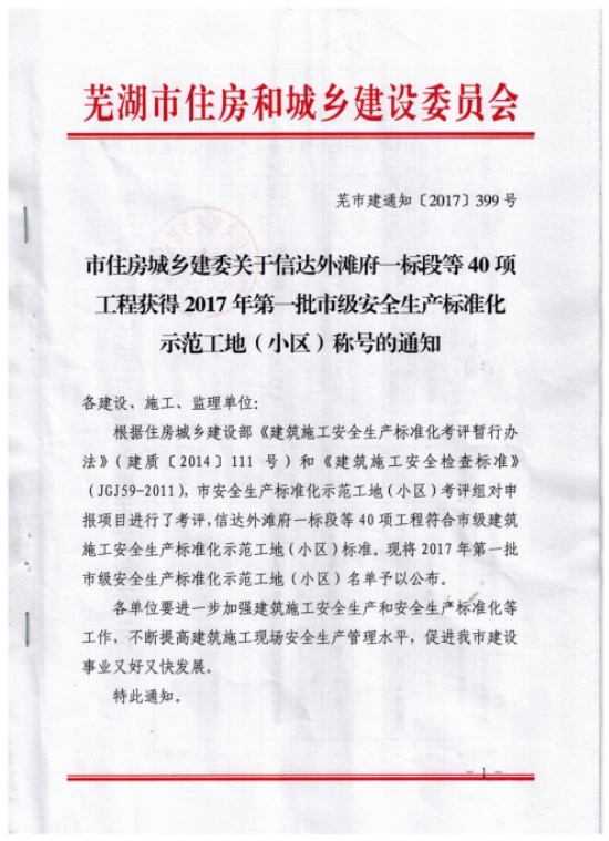 近日,經(jīng)蕪湖市安全辦領(lǐng)導(dǎo)、專家組成的安全標(biāo)準(zhǔn)化評(píng)審組嚴(yán)格、認(rèn)真地評(píng)審,我公司無為縣城東工業(yè)園區(qū)福東北路(緯一路-福貿(mào)路)工程獲得2017年第一批市級(jí)安全生產(chǎn)標(biāo)準(zhǔn)化示范工地稱號(hào),也是蕪湖市目前唯一獲得該稱號(hào)的市政道路工程。
