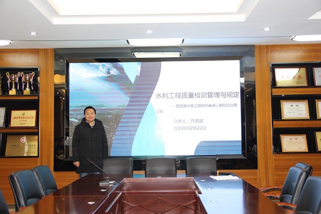 2019年02月22日下午,在聯海集團5樓會議室召開了2019年首次項目復盤分享會,由合肥市天秤水利工程質量檢測有限公司方蘇波同志主持分享了《水利工程質量檢測管理與規定及項目復盤分享》,集團公司全體員工參加了此次會議。