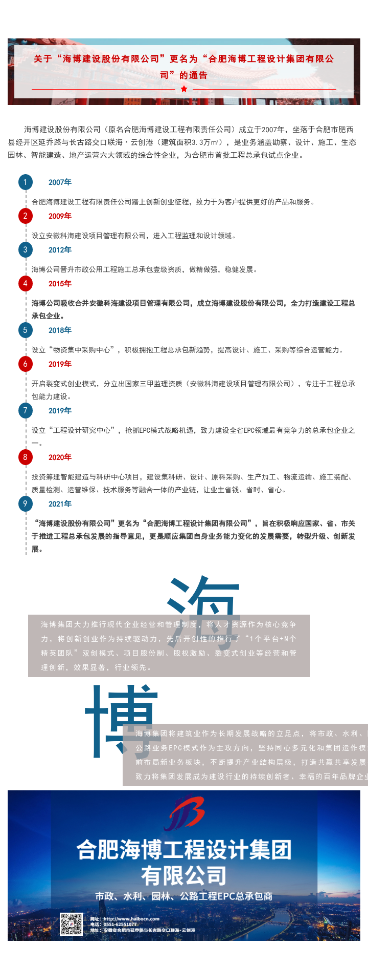 關(guān)于“海博建設(shè)股份有限公司”更名為“合肥海博工程設(shè)計(jì)集團(tuán)有限公司”的通告