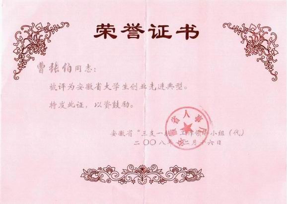 我公司執(zhí)行董事曹張伯被安徽省人事廳評(píng)為“安徽省大學(xué)生創(chuàng)業(yè)先進(jìn)典型”。