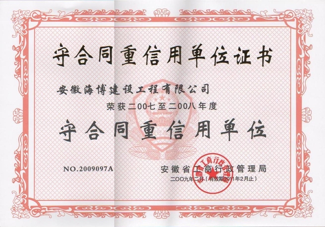 近日,省工商行政管理局正式給我公司頒發(fā)2007—2008年度省級“守合同、重信用”榮譽(yù)證書。